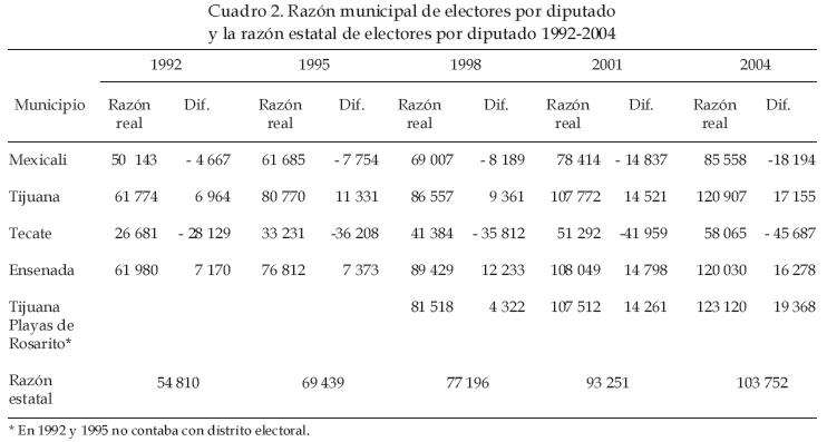 En función de lo antes dicho, podemos afirmar que Baja California conforma un sistema de representación asimétrico en donde, atendiendo a la distribución de escaños por municipio, existe una desviación constante respecto a los electores habilitados durante la trayectoria del periodo 19922004.
