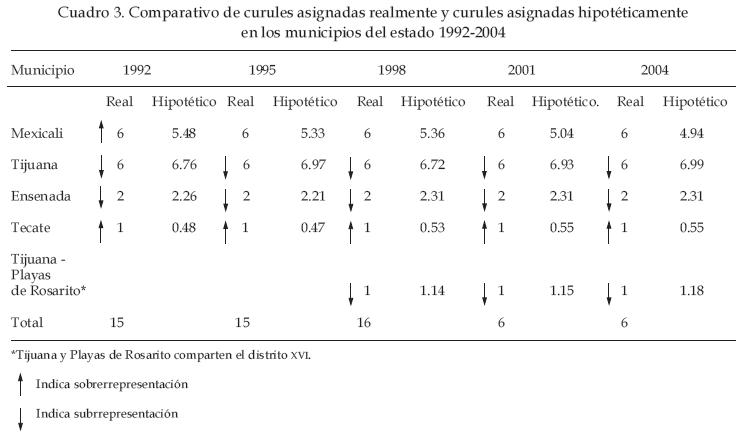 Las inferencias que podemos derivar es que durante todo el periodo analizado (19922004) estuvo siempre presente algún nivel de desaveniencia entre curules asignadas realmente y curules hipotéticas que debieron corresponderle a cada municipio. Como podemos ver, en los cinco procesos electorales siempre los municipios de Mexicali y Tecate registraron algún nivel de sobrerrepresentación, es decir, les fue asignada una cuota de representación que no les correspondía, mostrándose un nivel de ventaja en la representación con relación al resto de los municipios.