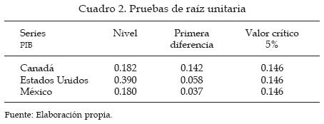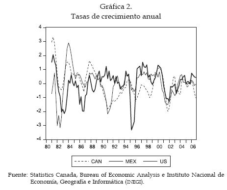 Resalta en primera instancia una marcada similitud en las tendencias de las series de 1995 a 2005. Cabe señalar, sin embargo, que la misma es aparente entre los años 1990 y 1994. Con respecto a las tasas de crecimiento, se notan varios episodios en los cuales las dinámicas de las series son similares. Podríamos mencionar los periodos 19801989 y de 1992 a la fecha; esto a pesar de que en 1995 la economía de México cayó significativamente; no obstante, las series siguen una dirección común. Así, con base en la gráfica 2, podríamos indicar que el único periodo en poco más de dos décadas en el que las tasas de crecimiento de los tres países no siguen una dinámica similar es de 1989 a 1992. Es claro, sin embargo, que para establecer formalmente el grado de sincronización que existe en las economías no basta con el análisis visual de las series. De tal forma que en el siguiente apartado mostramos algunos resultados econométricos que prueban que las economías de América del Norte se encuentran sincronizadas.