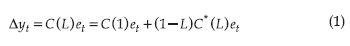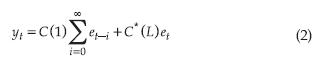 La primera parte de esta relación representa el componente de tendencia del sistema, y la segunda el componente cíclico estacionario. Al realizar el ejercicio de cointragración se pretende obtener α'C(1) = 0 donde α representa la matriz de coeficientes de cointegración. De la misma forma, para identificar la existencia de ciclos comunes se espera que