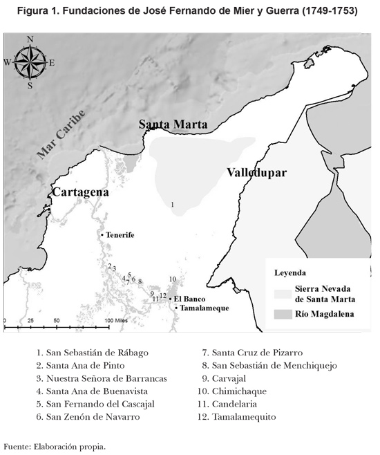 La labor que Mier y Guerra llevó a cabo significó la fundación de 12 pueblos ubicados casi todos en la margen derecha del Magdalena en una primera etapa que le tomó cuatro años (ver figura 1). En este tiempo, el pacificador trató de establecer el orden social que pretendía la Corona, sin embargo lo que sustenta este texto, es que más allá de controlar, lo que impulsó fue que la población que era el objetivo de las campañas o entradas, se replegara hacia el monte o selva e iniciara un nuevo ordenamiento social y cultural totalmente autónomo, por fuera de la vigilancia y control de la Corona y la Iglesia (ver figura 2).