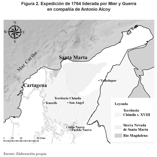 Se entiende de esta forma que el establecimiento de fronteras fue un proceso social que antes que controlar, permitió el florecimiento de la sociedad marginal. Por fuera de los márgenes de la dominación colonial (Sæther, 2005). La misma conformación de las milicias que utilizó Mier y Guerra para adentrarse al territorio Chimila es un caso con el que podemos sustentar esta afirmación. En el testimonio de la expedición que lideró en 1768 José Joaquín de Zúñiga (Castro, 2011): "catorce milicianos de las compañías de españoles y pardos, veinte y ocho naturales de los pueblos Bonda, Masinga y Mamatoc" (AGN, 1768). Al respecto Néspolo argumenta que estas actividades llevadas a cabo por milicianos mestizos, tenían el objetivo, más allá de servir a la Corona, de ganarse la calidad de vecino (Mier, 1987).