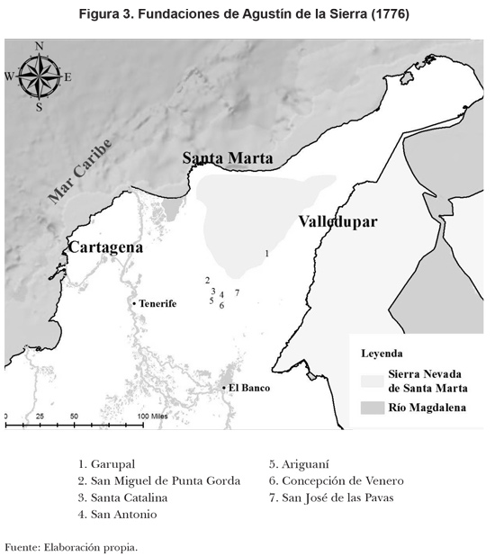 Después de la muerte de Mier y Guerra, en 1780 asumió el cargo de maestre el que fuera capitán de conquista, Agustín de la Sierra. En este período se provoca una nueva ola de poblaciones (González, 1978), estas son: Garupal (Misioneros Capuchinos); San Miguel de Punta Gorda (Misioneros Capuchinos); Santa Catalina; San Antonio (Misioneros Capuchinos); Ariguaní; Concepción de Venero; y San José de las Pavas (Misioneros Capuchinos) Véase la figura 3. El nombramiento de Agustín de la Sierra, se lleva a cabo por haber prestado sus servicios como capitán de conquista del maestre de campo Mier y Guerra por los lados de Valledupar. Fue un militar que había adquirido una vasta experiencia en la contención de los indios Chimila.