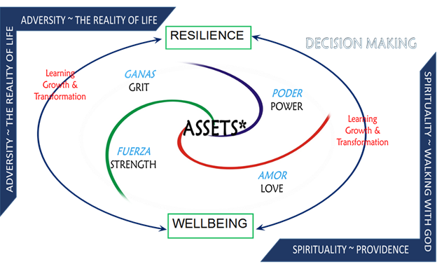 Research suggests that resilience is context dependent, expressed and promoted differently across individuals and group. This implies a need for an alternative discourse on resilience, one that recognizes contextual specificity (Davydov, Stewart, Ritchie & Chaudieu, 2010; Ungar, 2004). For Mexican immigrant women in the U.S., the contextual understanding of resilience has been largely absent in research so we used a constructivist understanding of strengths and spirit to explore their mental health. The accounts of the participants led to an understanding of resilience as the culmination of a highly dynamic process of growth and transformation derived from experiencing adversity mediated by spirituality and the interaction of several internal and social assets. Although participants in this study were unfamiliar with the term resilience, they identified several nouns in the Spanish language to interpret this response. These words and the explanations regarding how participants overcome life’s difficulties suggested four signposts of resilience for MIW: poder (personal power), fuerza (strength), ganas (tenacity), and amor (love), each of which were described in detail. The internal assets of resilient MIW are (1) ability to not indulge in victimhood, (2) determination to not let fear deter her efforts, (3) the meaning and purpose of her life, (4) weighing of the good in her life and the gratefulness derived from it, (5) eagerness to look for information and help to solve problems, and (6) self-motivation and self-reliance.