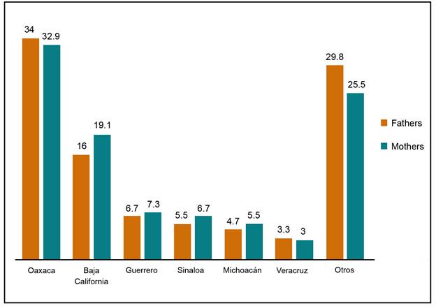 Figure 1 shows that the fathers and mothers, in similar proportions, who were born in Mexico are mainly from the states of Oaxaca, Baja California, Guerrero, Sinaloa, Michoacán and Veracruz. The state of Oaxaca is the place of birth of more than one-third of the parents; the state with the second highest population of people who spoke an indigenous language in the country in 2010 (Instituto Nacional de Estadística y Geografía [Inegi], 2010).