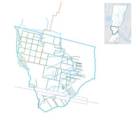Figura 6 Plano de elaboración propia con base en el original del ingeniero De Laberge (1867) que tiene como objetivo la representación gráfica del primer avance sólido de consolidación de un nuevo sistema de propiedad y explotación territorial en el área de estudio