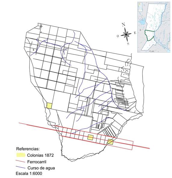 Figura 8 Representación gráfica en la cual se superponen los planos originales del agrimensor Carlos Chapeaurouge (1872) y de Gabriel Carrasco (1889), director del primer censo poblacional de la provincia. Las áreas cuadriculadas muestran el avance de la fundación de colonias, así como la subdivisión de las grandes estancias