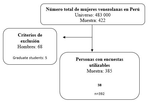 Se tuvo una muestra no probabilística por conveniencia. Dicha muestra tuvo una prevalencia máxima a la exposición de 50%, un margen de error de 5% y un nivel de confianza de 95%. La muestra de 384 personas debió aumentarse en 10% por pérdida o rechazo por lo que se obtuvo finalmente un tamaño muestral de 422 (Figura 1).