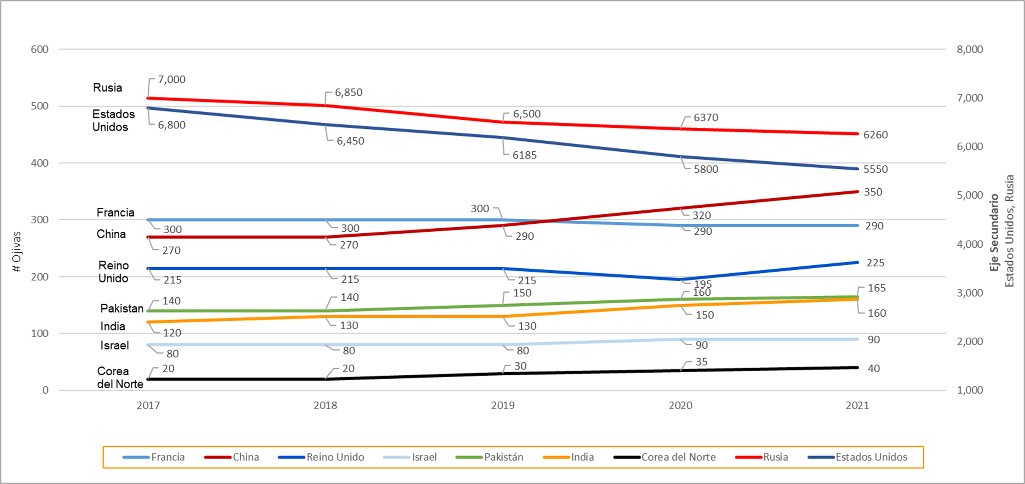 El TPAN se adoptó en 2017 y con la quincuagésima ratificación entró en vigor en 2021. El comportamiento numérico de los arsenales durante el periodo 2017-2021 (véase Figura 1) fue el siguiente: Rusia disminuyó sus arsenales nucleares de 7 000 a 6 260; Estados Unidos de 6 800 a 5 550; Francia de 300 a 290; y, Reino Unido de 215 a 195 pero después aumentó a 225. China tuvo una tendencia significativa en aumento de 270 a 350, no tiene acuerdos de reducción. India y Pakistán han tenido una serie de conflictos, y han mantenido la disputa de la región de Cachemira con una frontera militarizada. Estos dos países practican una disuasión que puede fallar en cualquier momento. India, durante el periodo 2017-2021, tuvo un incremento de 120 a 160 y Pakistán incrementó de 120 a 165. Israel ha mantenido el rango de 80-90 y tiene constantes conflictos con otros Estados en Medio Oriente. Corea del Norte y Corea del Sur tienen una frontera militarizada; Corea del Norte ha hecho una serie de pruebas con misiles y armas nucleares que ha generado tensiones con Corea del Sur; Estados Unidos y Japón, entre otros, piden la desnuclearización de la península coreana. Corea del Norte tiene un incremento de 20 a 40. La tendencia de los Estados es el incremento de sus arsenales, los que han disminuido sus arsenales con grandes cantidades aun mantienen altos números de armamento, proyecciones de presupuesto y tecnología.
