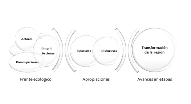 Durante la última década ha emergido el concepto de eco-frente (en inglés eco-frontier) para exponer la transformación de territorios sujetos a preocupaciones ambientales consideradas como apropiaciones espaciales y discursivas por actores con intereses ecológicos (De Sartre et al., 2012; Guyot, 2011; Guyot & Dellier, 2009; Laako & Kauffer, 2022; Ramutsindela et al., 2020). Los eco-frentes implican apropiaciones ecológicas que evolucionan en etapas históricas en los territorios supuestamente vírgenes o “salvajes” (en inglés wilderness). En otras palabras, los eco-frentes ayudan a explicar cómo los actores ecológicos influyen en transformar esos territorios, ya que están sujetos a preocupaciones ambientales (Guyot, 2011). La discusión académica de eco-frentes deriva de la disciplina de la ecología política, interesada en entender las relaciones de poder de los actores ecologistas en territorios diferentes, ahora sujetas, tanto al interés de conservación de la biodiversidad, como de la extracción y manejo de los recursos naturales (Guyot, 2011; Guyot & Dellier, 2009). De esta manera, el concepto de eco-frente sirve para visibilizar la transformación potencial de esos territorios por las acciones de los actores interesados en temas ecológicos.