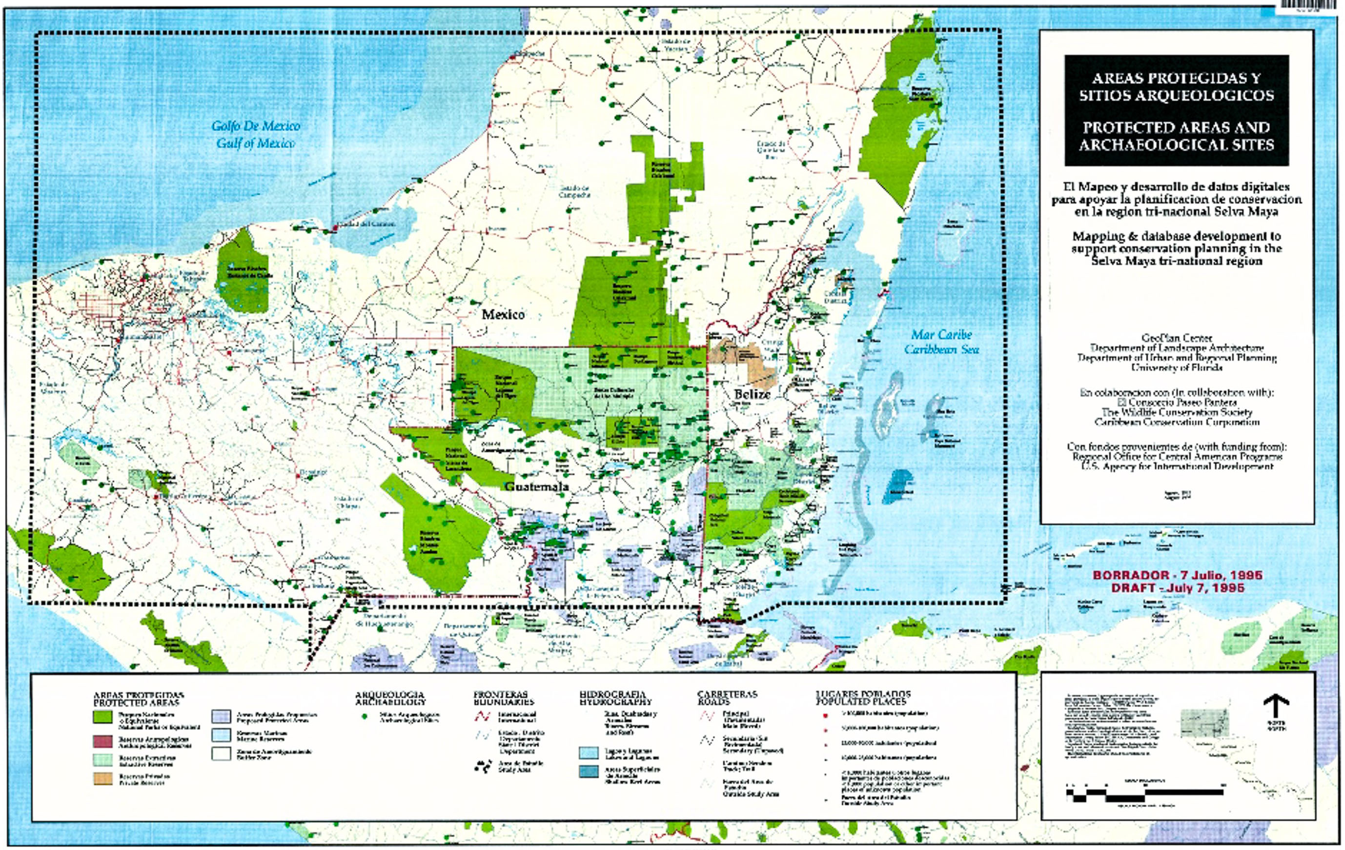 Figura 2 Borrador que ilustra la extensión original, áreas protegidas y sitios arqueológicos de la Selva Maya