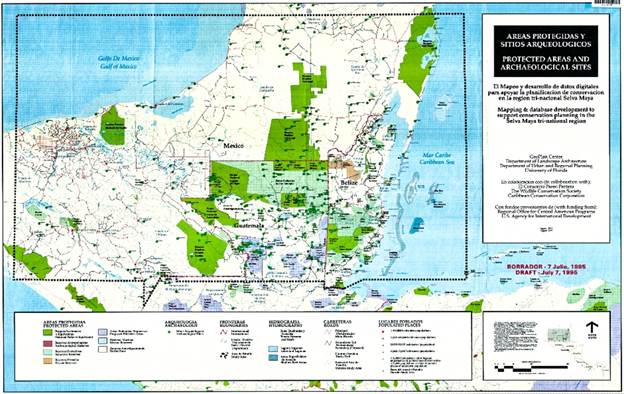 The Maya Forest is a concept created by conservationists and scientists in the 1990s. Maps and databases planning conservation measures were developed by the University of Florida in collaboration with the Paseo Pantera Consortium, Wildlife Conservation Society, Caribbean Conservation Corporation, NASA, and Ecosur (1995). The maps show a demarcation of the region composed of the states of Chiapas, Tabasco, Campeche, and Quintana Roo in Mexico, the Department of Petén in Guatemala, and all of Belize (Ecosur, 1995). These maps identify the existing and planned NPAs, archaeological sites, international and state borders, as well as hydrography, roads, and populated areas. The same databases also include analyses of vegetation (mainly high and medium rainforest), regional biodiversity, and priority conservation sites. These maps and databases (1995) are extremely important since they illustrate how the concept was created and what type of eco-region was defined as the basis of the Maya Forest. In this original plan, the focus was on the conservation of tropical forests principally by means of the NPAs.