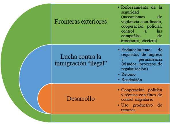 En este escenario, una noción de seguridad maleable se coló en la política migratoria de la UE a través de la idea de gestión migratoria (migration management), en la que se agrupan una multiplicidad de categorías bajo el denominador común del control migratorio. En este paradigma conviven al menos tres tendencias: la gestión migratoria es movilizada por los actores para conceptualizar y justificar sus intervenciones en el campo migratorio; se vincula a prácticas que forman parte de las políticas migratorias y que son promovidas por instituciones; y, refiere a un conjunto de discursos y nuevas narrativas sobre lo que la migración es y cómo debe ser abordada (Geiger & Pécoud, 2010).