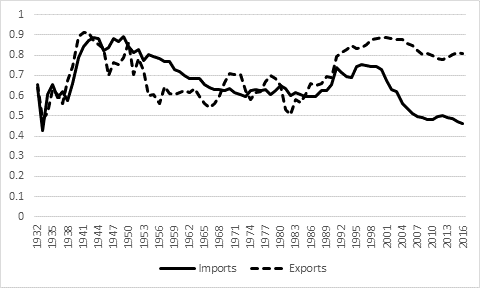 Figure 2 continues the story in Figure 1 from 1932 to 2016. Figure 2 is from official Mexican data and together with Figure 1 presents a long-run historical record showing that the United States has been the dominant market for Mexican exports for more than 135 years and nearly as long as the dominant source of its imports. Figure 2 has three visible regimes or periods. The first is from the late 1930s to the early 1950s when 80% to 90% of Mexico’s imports were supplied by the United States and 70% to 90% of its exports were sold there. The second period shows a decline in the US share to around 50% to 60% and lasts until the late 1980s. And the third shows a rise in exports to the United States to between 70% and 90% and a rise in imports from the United States to around 70% until 2001.