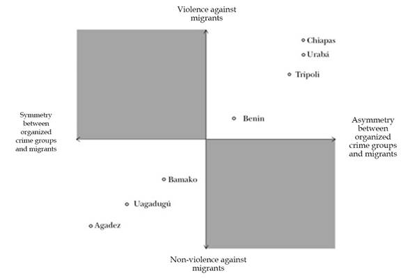 The Gulf of Urabá (Colombia), Chiapas (Mexico), Tripoli (Libya), Benin (Nigeria), Bamako (Mali), Ouagadougou (Burkina Faso) and Agadez (Niger) have similar conditions concerning irregular migration. These are transit zones, with a high level of involvement of the local population and institutional precariousness. Nevertheless, in the first four cases there are high levels of violence against migrants and transporters, while the phenomenon is basically peaceful in the remaining three cases.
