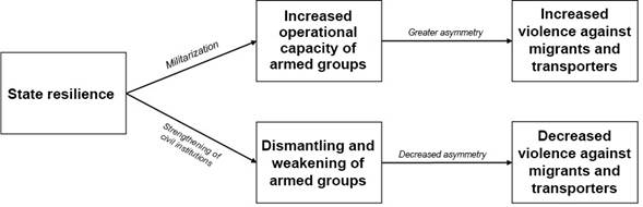 The argument works as an incentive system: state resilience, when it is principally composed of militarization tools, generates incentives for armed groups to form hierarchies and increase their force capability. This assumption is based on several pieces of research that show that the repression campaigns that States initiate against criminal groups are succeeded by increases in the levels of violence and organizational strengthening of the criminal groups fought (Castillo & Kronick 2020; Lessing, 2017; Skarbek, 2011). In the face of more hierarchical and strengthened armed groups, the asymmetry between them and migrants grows, which generates incentives to use more violence against migrants and transporters (Figure 1).