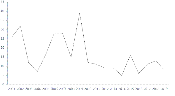 The demobilization of the FARC-EP in 2016 as a result of a peace agreement signed with the Colombian government finally consolidated the AGC’s hegemony in the Gulf of Urabá, as the organization’s last large-scale enemy disappeared. This may be reflected in a relative pacification of the region, as shown in Figure 4.