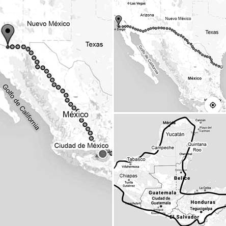 La Figura 2 está compuesta por tres imágenes tomadas directamente de la pantalla de un teléfono celular. En dos de ellas se puede apreciar la ruta que establece el geolocalizador cuando la instrucción consiste en ir de un extremo a otro, de Tijuana a Matamoros, en la imagen superior derecha; y de Tapachula a Tijuana en la imagen del costado izquierdo. La tercera imagen, la inferior derecha, hace referencia a la región conocida como el triángulo norte. Región conformada por algunos estados del sur de México ─Oaxaca, Chiapas, Tabasco, Quintana Roo─ y por países de Centroamérica ─Guatemala, Belice, Honduras, y El Salvador─. Por esta región cruzan las caravanas (de personas) migrantes que intentan llegar a Estados Unidos. Estas tres imágenes hacen referencia a tres de las categorías propuestas como parte del modelo epistemológico de la frontera y dan cuenta de la fronterización, como práctica de la frontera de la securitización: la frontera horizontal, la frontera vertical y la frontera interregional (Rodríguez Ortiz, 2014, 2020). A partir del trazado de la cartografía fronteriza, la fronterización, se pueden abstraer las estrategias de securitización fronteriza entre ambos países, estrategias que atienden, por un lado, a reterritorializar el espacio público y desestatizar el Estado nación, como se observa en la frontera interregional (la que corresponde a la región del triángulo norte) y, por otro, a la excepcionalidad de la soberanía del estado mexicano de cara a los mandatos condicionados del gobierno estadounidense.