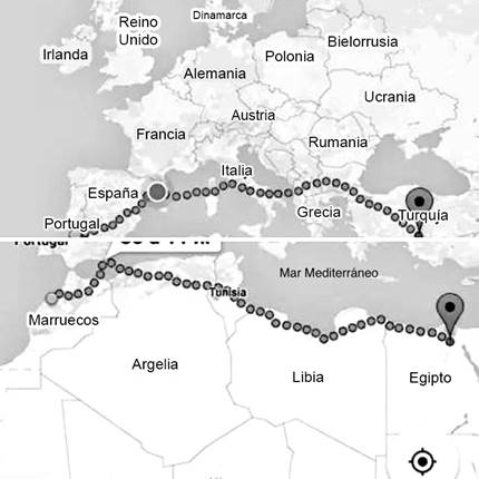 En la imagen inferior se recupera el trazo de la Figura 1 referente a la frontera horizontal en la que se convierten los países africanos y en la imagen superior se hace un trazo similar y en espejo en la costa norte del mar Mediterráneo, correspondiente a los países de la UE que funcionan como frontera territorial (España, Italia, Grecia), especialmente a partir de la aprobación, por el Parlamento Europeo, del reglamento Dublín III en 2013.16