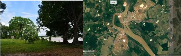 Figura 11 Imagen satelital y fotografías de la orilla boliviana desde la isla Suárez