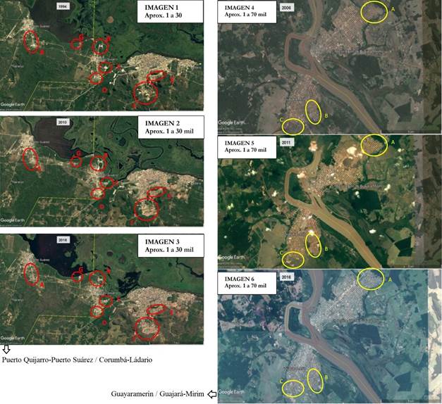 Las imágenes de la izquierda en la Figura 3 muestran la expansión de las aglomeraciones fronterizas de los dos lados de la frontera. En ambos casos, las ciudades bolivianas crecen más que las brasileñas en su superficie construida. Entre los años 1984 y 1990 este fenómeno tomó impulso en Puerto Suárez y luego se trasladó a Puerto Quijarro, donde se evidencia una mayor expansión, principalmente en los puntos B y C correspondientes a los embarcaderos de soya y en el punto D donde está el paso de frontera terrestre sobre un puente que une ambos países por Arroyo Concepción. En Guayaramerín la expansión urbana se da desde la orilla del río Mamoré y sigue en dirección perpendicular a su curso (punto C). Los puertos en la ribera son los puntos centrales de mayor densidad de actividades. También se observan limitaciones biofísicas que parecerían dificultar el crecimiento urbano, el aeropuerto (punto B) y también el cuerpo de agua que recorre de suroeste a noreste.