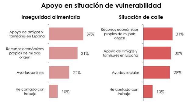 La primera práctica agrupa la búsqueda predominante de ayudas sociales (Hagan, 2023) por fuera del sistema de acogida e instituciones del Estado, que muchas veces se ven desbordadas y saturadas, en lo que respecta a la protección internacional (Comisión Española de Ayuda al Refugiado [CEAR], 2019). Para evitar ser detenidos por tener un documento caducado, una carta de expulsión o ser procesados bajo el Reglamento de Dublín, los solicitantes de protección internacional privilegian sus redes de amigos y familiares que les proveen ayudas. Como se puede evidenciar en la Figura 2, los resultados de la encuesta señalan que estas ayudas van encaminadas, fundamentalmente, en dos sentidos: evitar la vulnerabilidad alimentaria (incapacidad de proveerse tres platos diarios) y evitar la situación de calle.4
