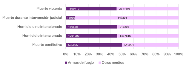 Y a pesar de que la tasa de homicidios con armas de fuego disminuyó entre 2013 y 2017, y la pandemia por COVID-19 provocó una reducción temporal, la reactivación nacional retomó las tendencias delictivas, manteniéndose el homicidio con arma de fuego por encima de 70% durante la última década (Fundación Ideas para la Paz, 2023; ONU, 2023; United Nations Office on Drugs and Crime, 2020b).