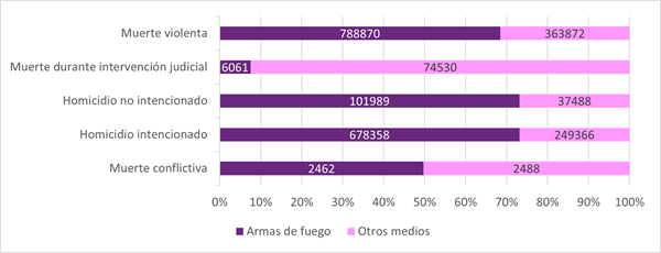 Según el Protocolo de Palermo de 2001, el tráfico ilegal de armas comprende la transferencia no autorizada de armas entre Estados parte, lo que evidencia la necesidad de reforzar los controles en el origen para impedir su circulación entre grupos criminales (Organización de las Naciones Unidas [ONU], 2001; United Nations Office on Drugs and Crime, 2020a). El bien jurídico protegido es la seguridad colectiva, entendida como un estado que permite a los individuos desenvolverse con confianza en una comunidad y usar sus bienes jurídicos individuales de forma segura bajo la protección estatal frente a elementos peligrosos (Hava García, 2019). Así, la importancia de controlar el tráfico ilegal de armas se evidencia en que estas tienen una alta participación en los homicidios y muertes violentas a nivel mundial (véase Figura 1).