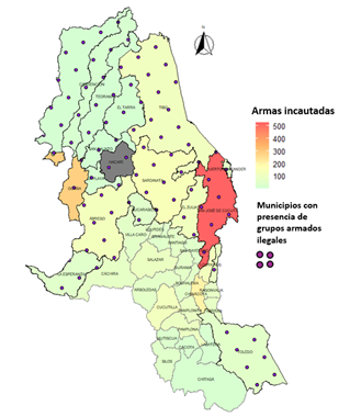 Este patrón puede explicarse por la facilidad y el bajo costo asociados a la adquisición de armamento no corto (como escopetas y revólveres). Por ejemplo, fusiles FAL con marcas del ejército venezolano se ofertaban a precios bajos, alrededor de 500 000 pesos colombianos. Además, tanto en zonas rurales como urbanas, muchas familias poseen escopetas como medio de protección o símbolo de poder, en un contexto marcado por la presencia de diversos grupos armados y delincuenciales a lo largo del departamento. A esto se suman las relaciones parentales que algunos habitantes de zonas rurales mantienen con miembros de grupos armados. Todo esto favorece el acceso a armamento con mayores capacidades que las pistolas.