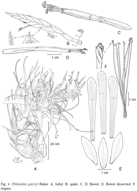 Tillandsia parryi Baker, J. Bot. 25: 277. 1887. Type: San Luis Potosí, chiefly in the region of San Luis Potosí, 22° N, C. C. Parry & E. Palmer 873 (holotype: K!; isotypes: GH!, MO!, PH!, US!). Fig. 4.