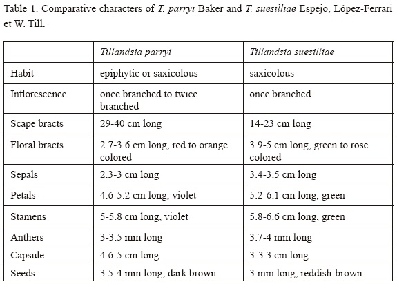 Se aclara la aplicación correcta de los nombres Tillandsia parryi Baker y T. sueae Ehlers y se describe como nueva T. suesilliae. Se aportan datos relativos a la distribución, ecología y fenología de los taxa estudiados.