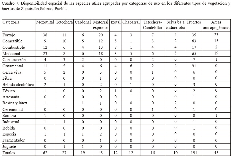 En cuanto al estudio de disponibilidad espacial de la flora útil en su conjunto, se encontró que el mayor número de especies (191) crecen dentro de los huertos y entre ellas están las 124 que son exclusivas de estos sitios. además de otras 67 que pueden también localizarse en los distintos tipos de vegetación o en las diversas áreas transformadas de la zona. El segundo lugar lo ocupa el mezquital (62 spp.). mientras que el matorral espinoso y las áreas antropogénicas. como los campos de cultivo. incluyen 43 especies útiles cada una (Cuadro 7).