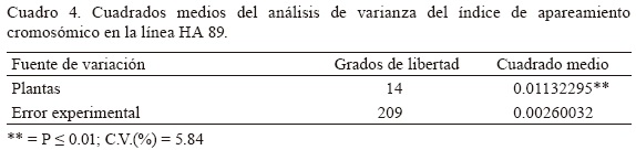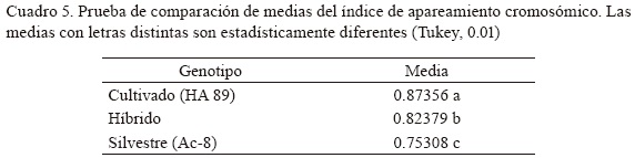 Los cuadrados medios del análisis de varianza del índice de apareamiento cromosómico se presentan en el Cuadro 3. Se detectaron diferencias altamente significativas entre los genotipos así como entre plantas dentro de las poblaciones silvestres e híbridas, lo cual parece deberse tanto a la variación genética como a la inducida por el hábitat. Para investigar posibles efectos ambientales sobre el índice de apareamiento cromosómico se realizó un ANOVA con solamente la línea HA 89 (Cuadro 4). Se observaron diferencias altamente significativas entre plantas (de la línea HA 89), lo que muestra que el índice de apareamiento cromosómico presenta un componente de variación de origen no genético.
