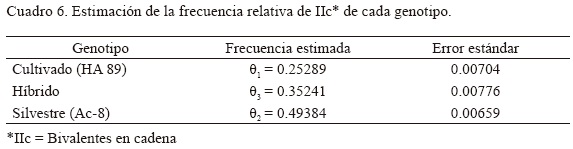 A partir de los registros del número de cadenas y anillos se estimó con máxima verosimilitud la frecuencia relativa de Ilc para cada material como su proporción muestral, y su error estándar (Cuadro 6). En el Cuadro 7 se presentan las pruebas de Razón Generalizada de Verosimilitud para las frecuencias relativas de IIc de las plantas cultivadas, silvestres e híbridas de girasol. Se detectaron diferencias altamente significativas entre los genotipos, tanto en la prueba global como en la comparación por pares. Esto demuestra contundentemente la existencia de una clara variación en el apareamiento cromosómico entre los tipos de planta analizados.
