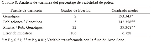 En el Cuadro 8 se muestran los cuadrados medios del análisis de varianza de la viabilidad de polen transformada con la función ArcSenVx/100. Se puede observar que existen diferencias significativas entre los genotipos, y altamente significativas entre poblaciones dentro de los mismos y entre plantas dentro de poblaciones.