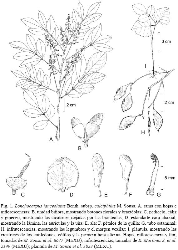 Lonchocarpus lanceolatus Benth. subsp. calciphilus M. Sousa, subsp. nov. Tipo: México, Oaxaca, Distr. Juchitán, Mpio. Santo Domingo, 5 km al N de La Venta; altitud 40 m, ripario en curso de agua de río de temporal, selva baja caducifolia, 28 octubre 1977,M. Sousa 8677y O. Téllez V. (holotipo: MEXU!). Fig. 1.