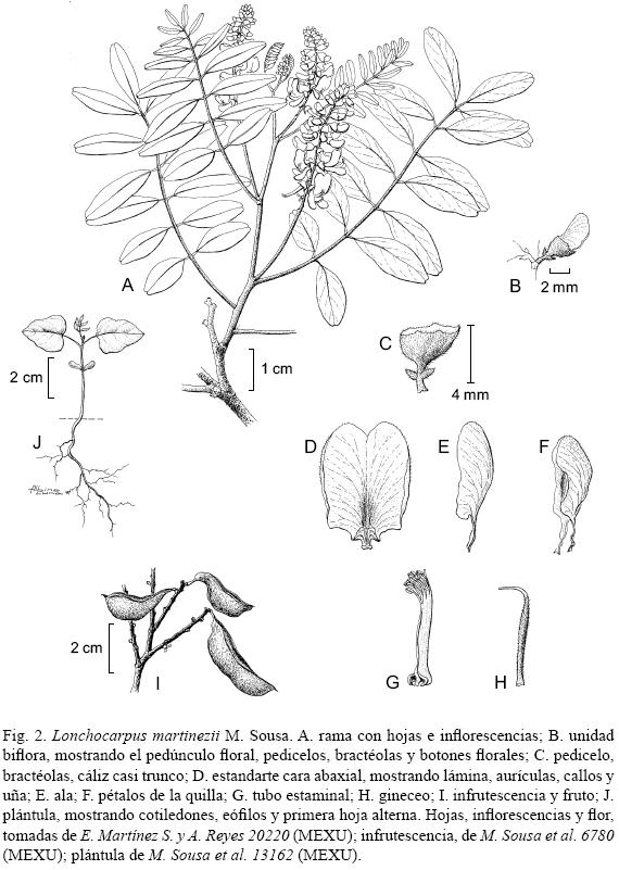 Lonchocarpus martinezii M. Sousa, sp. nov. Tipo: México, Chiapas, 80 km al SE de Villa Las Rosas, camino a Tzimol, municipio Tzimol. Vegetación selvas bajas caducifolias, altitud 800 m; 22 abril 1987. E. Martínez S. 20220 y A. Reyes G. (holotipo: MEXU!; isotipos: A!, BM!, K!, MO!, NY!, US!). Fig. 2.