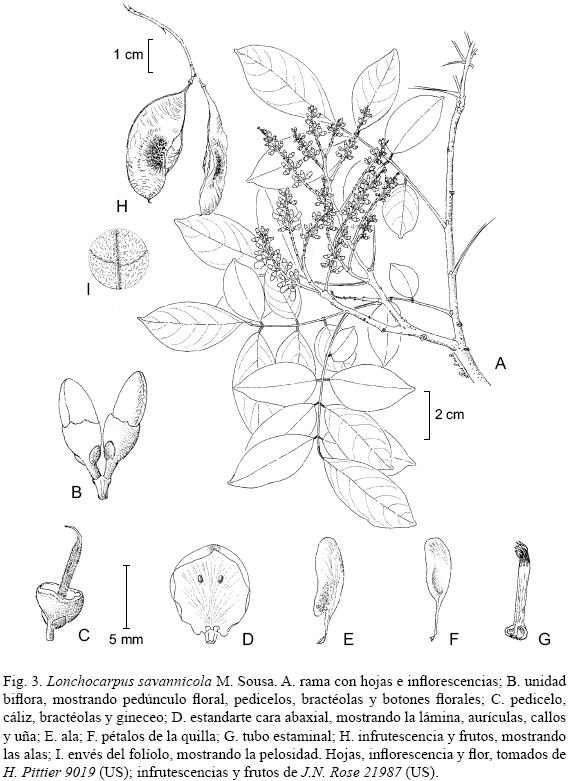 Lonchocarpus savannicola M. Sousa, sp. nov. Tipo: Venezuela, Carabobo, vicinity of Valencia, in hedges, woods, pastures, and savannas, altitud 500 m, 15 agosto 1920, H. Pittier 9019 (holotipo: US!; isotipo: GH!). Fig. 3.