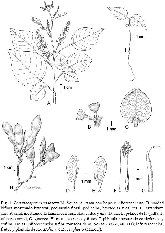 Lonchocarpus semideserti M. Sousa, sp. nov. Tipo: Honduras, Yoro, about 3 km of the small town of Arenal, close to the road towards Jocon on the lower slopes of the hills S of the Aguan Valley. Locally frequent, scattered along roadside and adjacent dry forest remnants with Haematoxylon, Acacia, Leucaena, and Opuntia, alt. 373 m, 15°22' N, 86° 51' W, 16 febrero 1991, J.J. Hellin & C.E. Hughes 5 (holotipo: MEXU!; isotipo: EAP!). Fig. 4.