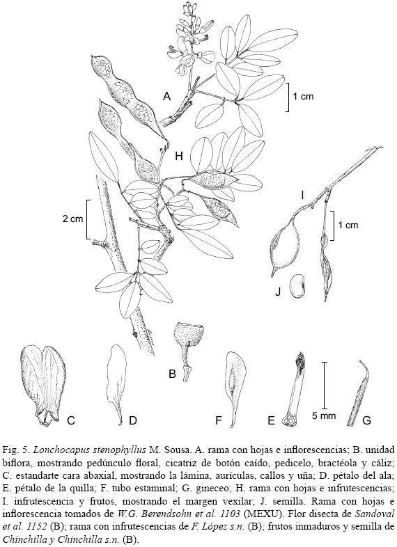 Lonchocarpus stenophyllus M. Sousa, sp. nov. Tipo: El Salvador, Ahuachapán, La Lechera, El Imposible, altitud 980 m; 13°50' N, 89°55' O; 23 marzo 1988. W.G. Berendsohny Villacorta 1103 (holotipo: B!; isotipos: MEXU!, MO!). Fig. 5.