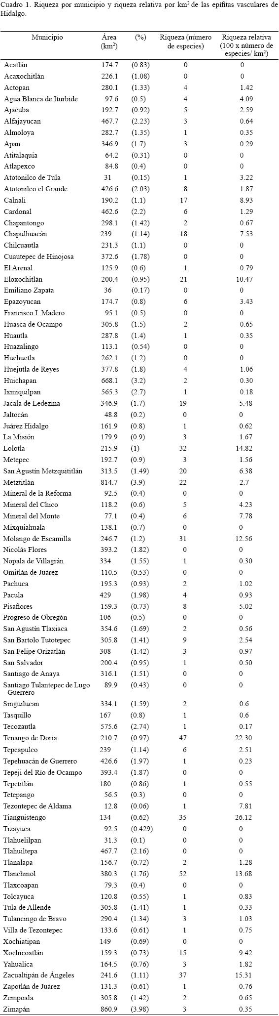 De los 84 municipios que integran el estado de Hidalgo, para 59 (70.2%) se tienen registros de epífitas, mientras que para los 25 restantes (29.7%) no se conoce ningún reporte. En cuanto a la riqueza, los municipios para los que se encontró el mayor número de especies fueron: Tlanchinol con 52 (31.9%), Tenango con 47 (28.8%), Zacualtipán con 37 (22.7%), Tianguistengo con 35 (21.5%), Lolotla con 32 (19.6%) y Molango con 31 (19%). Sin embargo, al considerar estas cantidades en relación con la extensión territorial de cada municipio, el primer lugar lo ocupa Tianguistengo, con una riqueza relativa (Núm. sp./km2 x 100) de 26.12, seguido por Tenango con 22.30, Lolotla con 14.82, Zacualtipán con 15.31, Tlanchinol con 13.68 y Molango con 12.56 (Cuadro 1) (Fig. 11). Es importante señalar que en los municipios de Chapulhuacán, Pisaflores y San Felipe Orizatlán, a pesar de tener tipos de vegetación particularmente ricos en epífitas, el número de registros encontrado es bajo, lo cual puede deberse a la falta de exploración botánica.
