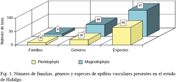 Como resultado de nuestro trabajo podemos concluir que hasta ahora para el estado de Hidalgo se conocen 17 familias, nueve de ellas pertenecientes a las Pteridofitas y el resto a las Magnoliofitas, 64 géneros y 163 especies de epífitas vasculares (Apéndice) (Fig. 1). Las familias mejor representadas a nivel genérico son: Orchidaceae con 28 taxa (43.75%), Polypodiaceae con 7 (10.93%), Bromeliaceae con 5 (7.81%) y Cactaceae con 4 (6.25%) (Fig. 2), y a nivel específico: Orchidaceae con 41 (25%), Bromeliaceae con 34 (20.73%), Polypodiaceae con 30 (18.29%), Piperaceae con 11 (6.7%) y Dryopteridaceae e Hymenophyllaceae con 10 (6.09%) cada una (Fig. 3).
