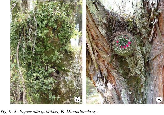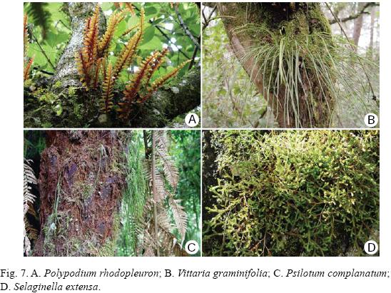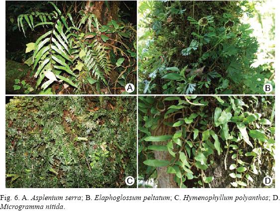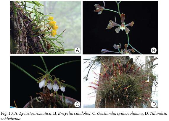 En lo que se refiere al intervalo altitudinal, nuestros resultados indican que entre los 1250 y 2250 m crecen la mayoría de los taxa, siendo Microgramma nitida (J. Sm.) A. R. Sm. (Fig. 6 D) la especie que se registra en la parte más baja del intervalo (120 m), mientras que Tillandsia violacea, T. erubescens y T. usneoides son las que se presentan en la parte superior del mismo (Fig. 5). Esta situación se asemeja a la reportada para Chiapas por Wolf y Flamenco (2003, 2005), quienes registran que la mayor concentración de especies ocurre entre los 500 y 2000 m s.n.m.