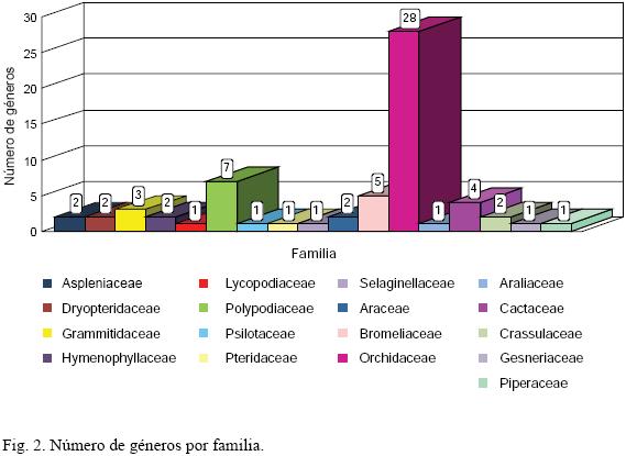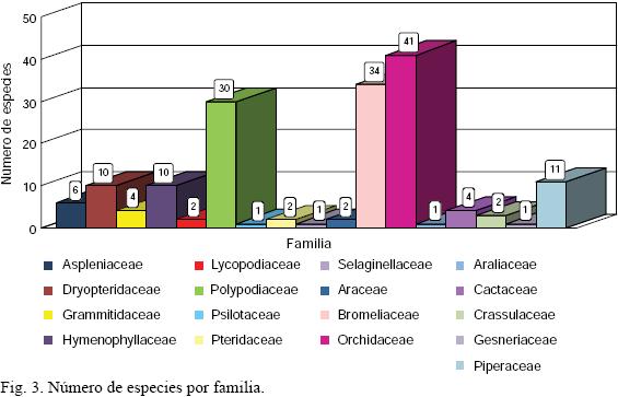 Los géneros con mayor número de especies son: Tillandsia con 25 (15.24%), Polypodium con 18 especies (10.97%) y dos variedades, Peperomia con 11 (6.7%) y Elaphoglossum con nueve (5.48%).