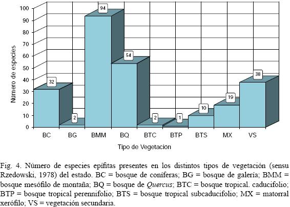 Como era de esperarse, el bosque mesófilo de montaña es el tipo de vegetación en el cual se presenta la mayor cantidad de especies con hábito epífito (94), seguido por el bosque de Quercus (54) y por la vegetación secundaria (38) derivada de los mismos (Fig. 4). Esto coincide con lo mencionado para algunos bosques neotropicales (Gentry y Dodson, 1987; Wolf y Flamenco, 2003, 2005).
