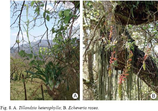 Se registran por primera vez para el estado los siguientes taxa: Tillandsia filifolia Schltdl. & Cham., Tillandsia heterophylla E. Morren (Fig. 8 A) y dos especies de Pleurothallis (sensu lato), género para el cual no se tenían registros de la entidad. En lo tocante a los elementos epífitos endémicos de Hidalgo podemos señalar que sólo las orquídeas Laelia gouldiana Rchb. f., una especie no descrita del género Goodyera (R. Jiménez, com. pers.) y Dignathe pygmaeum Lindl. pertenecen a esta categoría.