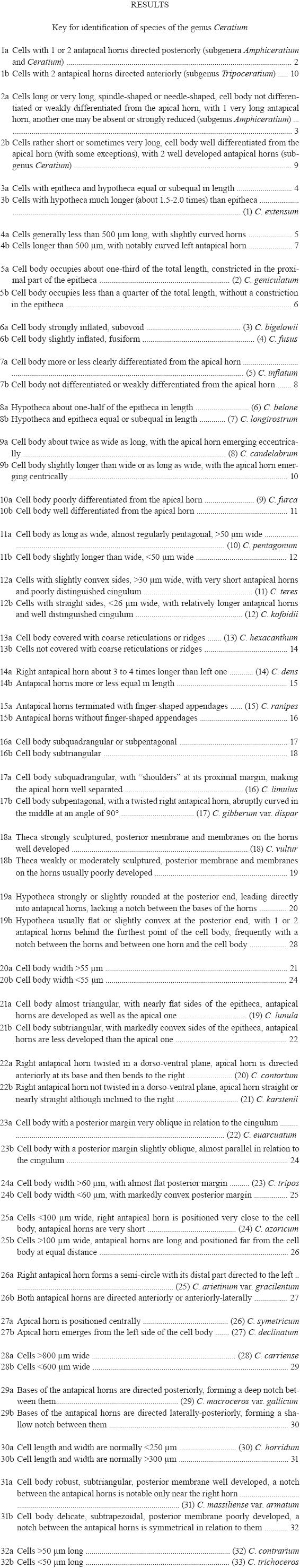 The taxonomy of Ceratium has remained extraordinarily stable since the end of the 19th century in spite of many important contributions to the morphology and systematics of this genus. Most Ceratium species have three horns; some have two. Recently a species with only one horn, the apical one, was described from a lake (Temponeras et al., 2000). Sournia (1986) clearly indicated the difference between freshwater and marine species based on the number of cingular plates. However, using genetic molecular analysis the genus was split into two, and a new genus designated as Neoceratium F. Gómez, D. Moreira et P. LópezGarcía for all known marine species (Gómez et al., 2010) was proposed. Traditionally, identification of species and infraspecific taxa within this genus is based on the shape of the cell and its parts (mainly antapical horns) in ventral or dorsal view and some other features of the theca usually shared by a group of species. This is the approach followed here in describing species belonging to the genus Ceratium according to Sournia (1986).