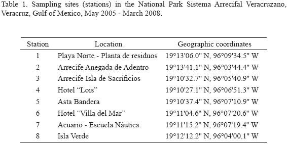 Phytoplankton samples were taken weekly with a hand net, 20 µm mesh and 30 cm mouth, from eight sites (stations) around the Aquarium of Veracruz in the northwestern part of the National Park Sistema Arrecifal Veracruzano. Collections were made during the period from May 2005 through March 2008 as part of the monitoring program of the Aquarium of Veracruz (Fig. 1, Table 1). Some material was taken and examined from two additional stations sampled in NovemberDecember 2007 and in March 2008 (19°02'48.1" N, 95°49'25.4" W; 19°10'26.9" N, 96°01'1.3" W). At each station the net was towed horizontally for 5 min. at the velocity of the boat of ca. 2.5 knots to sample a superficial 30cm layer. The samples were fixed with a stock formaldehyde solution to a final concentration of 4% and stored in 100ml dark plastic bottles. To contrast the cells for an easier search and better photographs, a 0.2% Trypan Blue water solution was added to water mounts (Lebour, 1925; Taylor, 1978). About 600 samples were analyzed using a Nikon TS100 and an Olympus CKX41 inverted microscope for a SedgwickRafter 1ml chamber and an Olympus BX51 compound microscope for water mounts. The cells were photographed mainly with an Olympus C7070 digital camera. Line drawings were made from digital images.