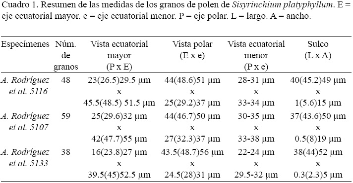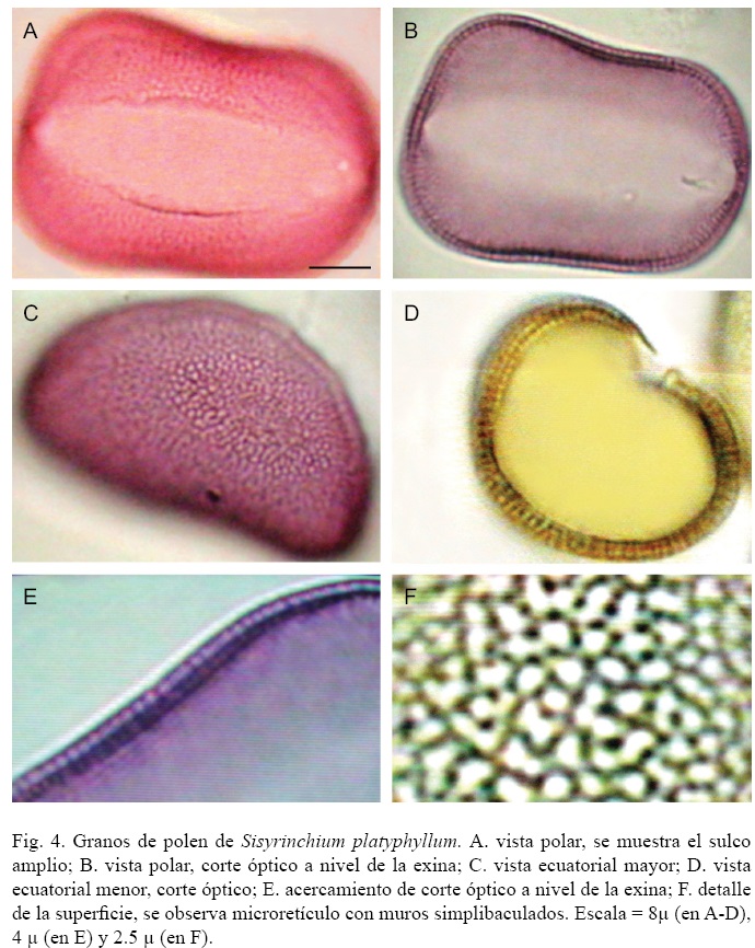 Descripción palinológica (Fig. 4): grano heteropolar, bilateral, monosulcado, oblato, de 23(26.5)29.5 µm x 45.5(48.5)51.5 µm en vista ecuatorial mayor. P/E= 0.55. Vista ecuatorial menor de 28-31 µ x 33-34 µm. P/E= 0.86, oblato esferoidal. Vista polar elíptica con los lados ligeramente convexos de 44(48.6)51 µm x 25(29.2)37 µm en sus ejes ecuatoriales. Exina semitectada, de 1.7(2)2.1 µm de grosor, sexina de 1(1.1)1.2 µm y nexina de 0.7(0.8)0.9 µm de espesor, microreticulada, heterobrocada; retículos poligonales; muros simplibaculados. Sulco de 40(45.2)49 µm de largo y 1(5.6)15 µm de ancho. La apertura monosulcada y la exina reticulada de Sisyrinchium platyphyllum son características que comparten las especies del género (González, 1969; Heusser, 1971; Erdtman, 1972; Markgraf y D'Antoni 1978; Zavada, 1983).