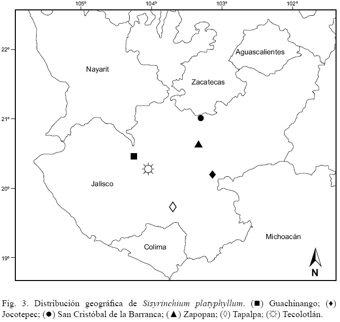Distribución y hábitat: Sisyrinchium platyphyllum es endémico de Jalisco. Se conocía, hasta ahora, únicamente de tres números de colecta obtenidos en o cerca de la localidad tipo (C. G. Pringle 2876, 1889; C. G. Pringle 3847, 1891 y C. G. Pringle 11192, 1902). Material recolectado recientemente documenta su presencia en los municipios de San Cristóbal de la Barranca y Zapopan en la zona de la barranca del río Santiago y en los municipios de Guachinango, Jocotepec, Tapalpa y Tecolotlán (Fig. 3). El taxon crece en el pastizal derivado del bosque mixto de Quercus y Pinus, el encinar y el bosque tropical caducifolio sobre los taludes a lo largo de los caminos entre los 1400 y 2000 m. También se ha observado cerca de cultivos y en zonas con suelos muy húmedos. En los alrededores de San Cristóbal de la Barranca y de Zapopan, S. platyphyllum convive con Quercus resinosa Liebm., Lysiloma acapulcense (Kunth) Benth., Eysenhardtia polystachya (Ortega) Sarg., Calochortus purpureus (Kunth) Baker, C. hartwegii Benth., Polianthes zapopanensis E. Solano & Ríos-Gómez, Manfreda scabra (Ortega) McVaugh, Tigridia mexicana Molseed ssp. passiflora Molseed, T. meleagris (Lindl.) G. Nicholson y Dahlia coccinea Cav. De forma similar, en la población de Guachinango crece junto a Quercus resinosa, Manfreda scabra, M. guttata (Jacobi & C.D. Bouché) Rose, Polianthes longiflora Rose, P. platyphylla Rose, Tigridia mexicana Molseed ssp. lilacina Molseed, T. dugesii S. Watson, Calochortus purpureus, C. fuscus Schult. f., Milla biflora Cav., Bessera elegans Schult. f., Hymenocallis jaliscensis M.E. Jones y Echeandia pringlei Greenm.
